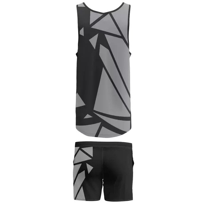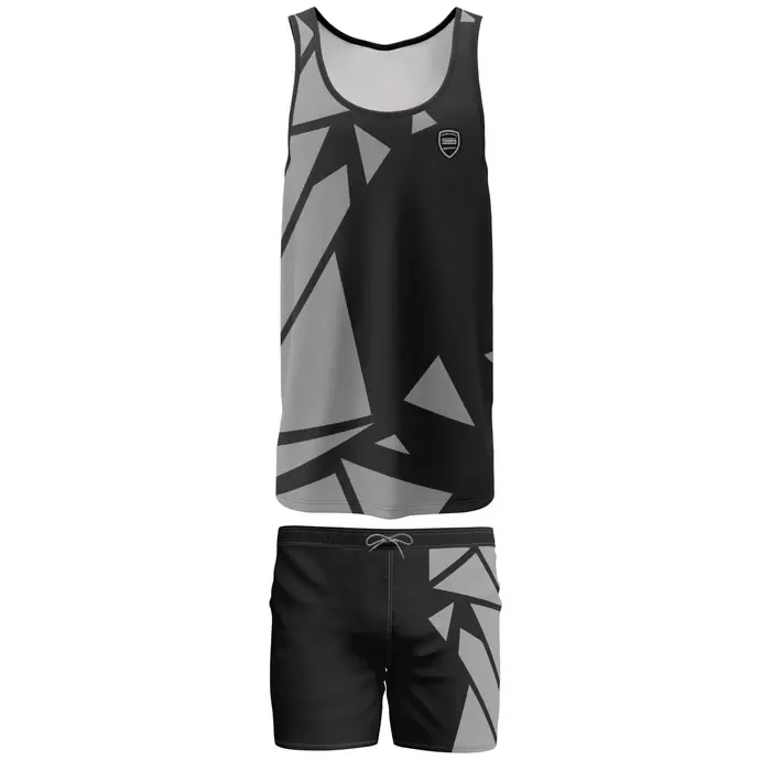 Discover premium AFL uniforms from Colaro Sports, the leading manufacturer of high-performance AFL uniforms designed for champions. Colaro Sports presents a modern AFL uniform with a sophisticated geometric pattern featuring abstract triangular shapes in grey and black shades. The sleeveless tank top paired with black athletic shorts creates a contemporary athletic aesthetic. Small chest logo adds branding authenticity. Smooth, stretchy polyester-spandex fabric ensures flexibility and comfort. This design-forward uniform appeals to teams seeking cutting-edge style combined with technical performance excellence.
