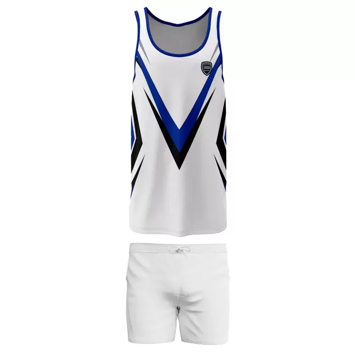 Discover premium AFL uniforms from Colaro Sports, the leading manufacturer of high-performance AFL uniforms designed for champions. Colaro Sports white AFL uniform features sleek geometric patterns with blue and black accents. The tank top showcases a large V-shaped stripe across the chest with diagonal side stripes, creating dynamic visual lines. Round neckline and embroidered logo on left chest add premium details. Plain white shorts with a drawstring waistband maintain a clean aesthetic. Modern design meets performance functionality perfectly.