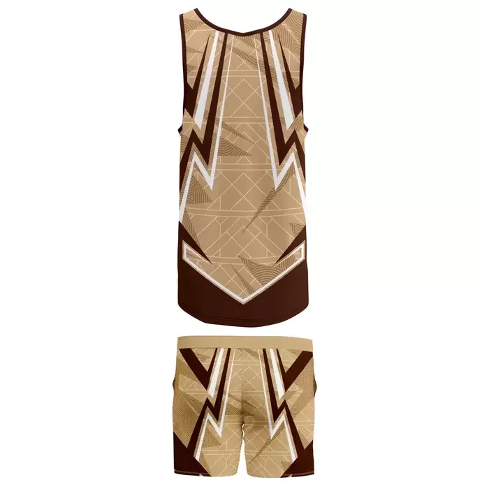 Discover premium AFL uniforms from Colaro Sports, the leading manufacturer of high-performance AFL uniforms designed for champions. Colaro Sports presents Art Deco-inspired AFL uniform with distinctive zigzag geometric pattern. The sleeveless crew-neck tank top and matching shorts feature bold patterns in brown, beige, and white shades, creating vintage-modern fusion aesthetics. The vibrant, stylized design brings a fashionable twist to athletic wear. This unique uniform appeals to teams seeking standout retro-contemporary style combined with modern performance functionality.