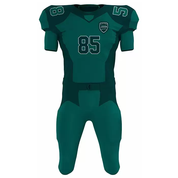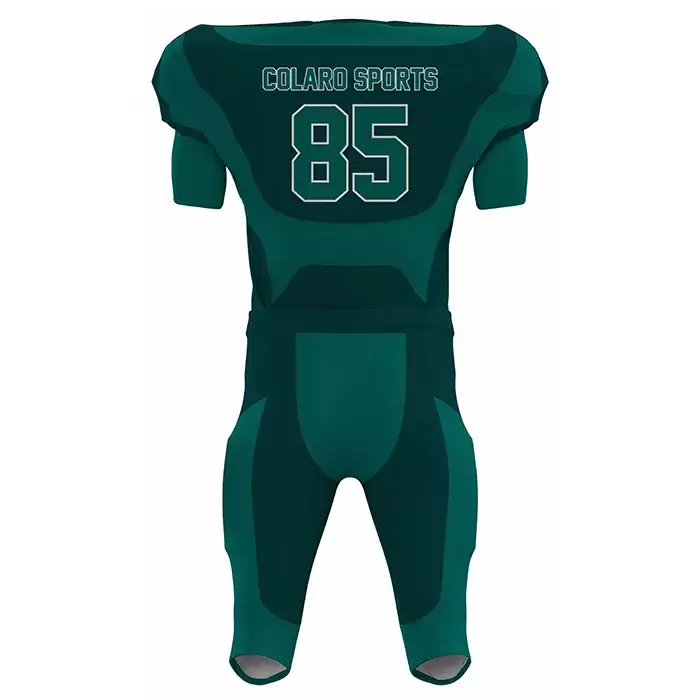 Discover premium American Football uniforms from Colaro Sports, the leading manufacturer of high-performance American Football uniforms designed for champions. Colaro Sports introduces a dark green American football uniform with a clean, functional design. The jersey features white number 85 and subtle Colaro Sports branding logo, paired with matching pants and integrated knee pads. Crafted from a smooth synthetic fabric, this cut-and-sew uniform focuses on comfort, flexibility, and dependable athletic performance.