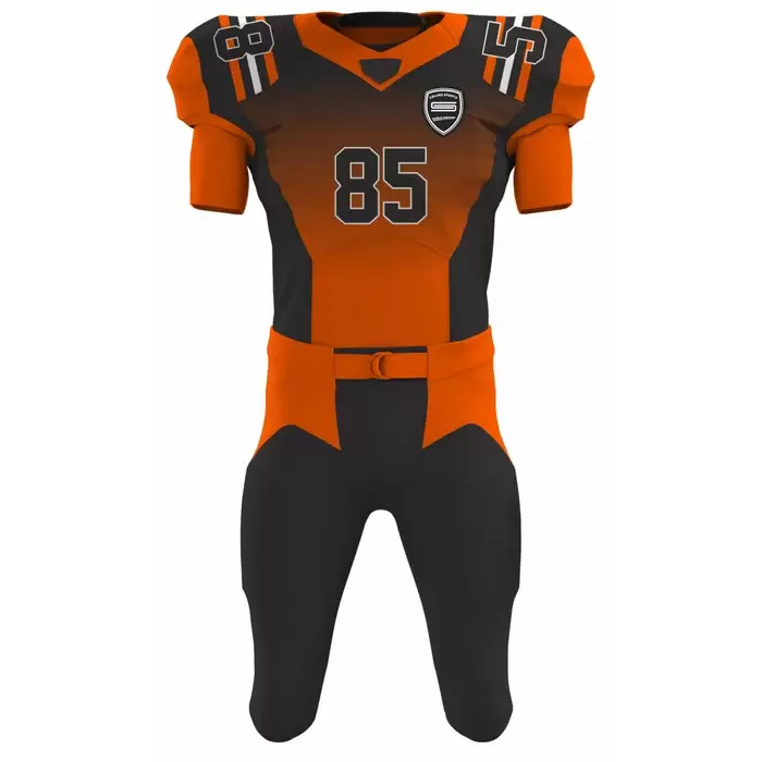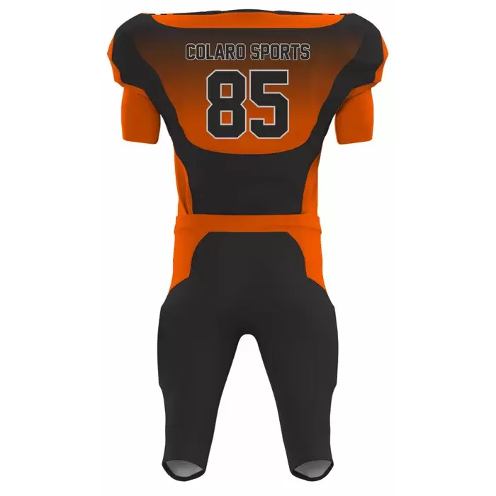 Discover premium American Football uniforms from Colaro Sports, the leading manufacturer of high-performance American Football uniforms designed for champions. Colaro Sports presents a modern orange and black American football uniform designed for high school and college teams. Featuring bold white number 85 and a prominent team logo, this sublimated uniform delivers a sleek, powerful look. The matching pants with black accents ensure durability, flexibility, and standout performance on the field.
