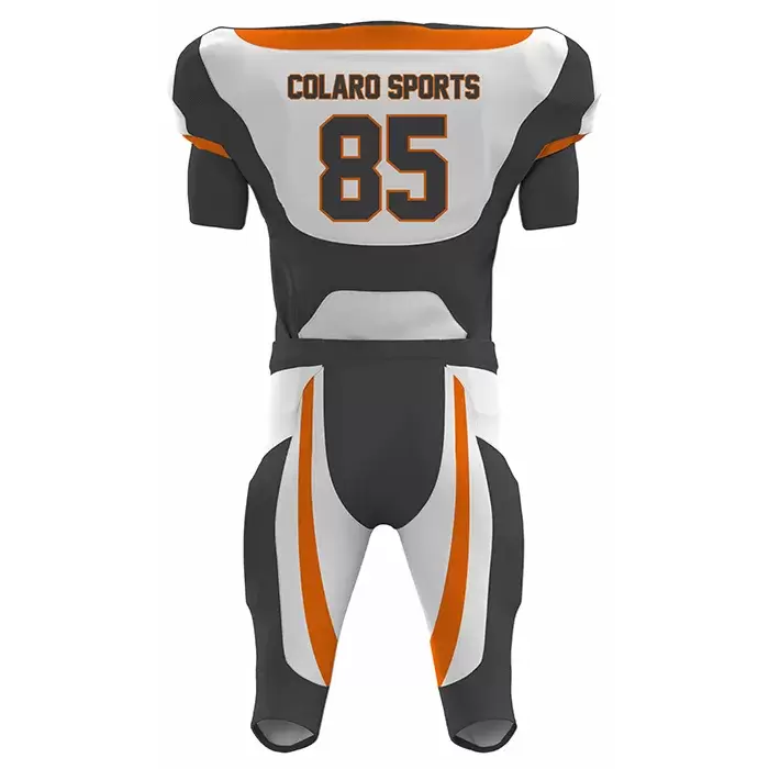 Discover premium American Football uniforms from Colaro Sports, the leading manufacturer of high-performance American Football uniforms designed for champions. Colaro Sports introduces a clean white and gray American football uniform accented with bold orange details. Featuring a V-neck jersey and striking number 85, this sublimated design combines elegance and performance. The coordinated stripes and team logo create a professional look, ideal for teams seeking modern style and comfort.