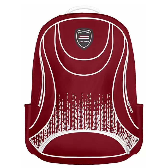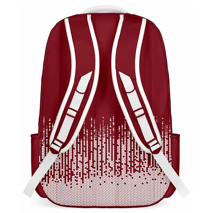 Discover premium Backpacks from Colaro Sports, the leading manufacturer of high performance Backpacks crafted specifically for athletes. Colaro Sports vibrant red sublimation backpack flowing white wave patterns and a clean shield-style logo. With its sleek, contemporary look and textured lower detailing, it offers a perfect balance of modern design and practicality, making it ideal for sports, school, or everyday use.
