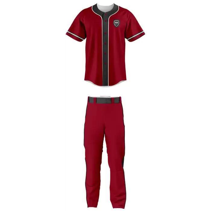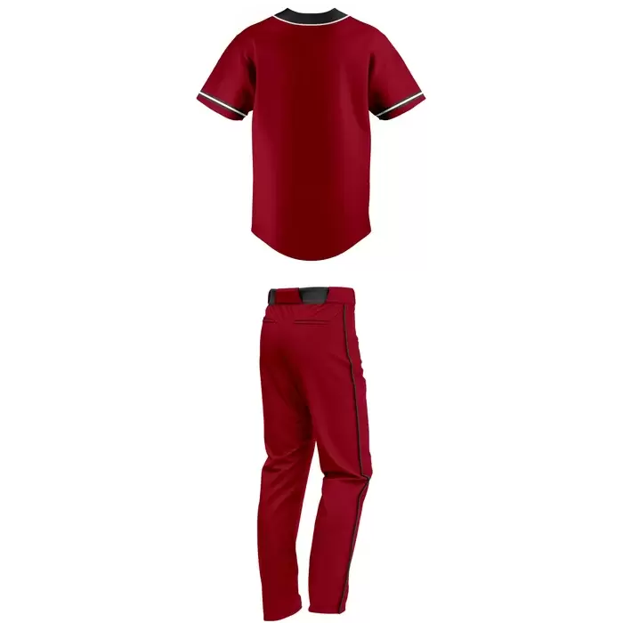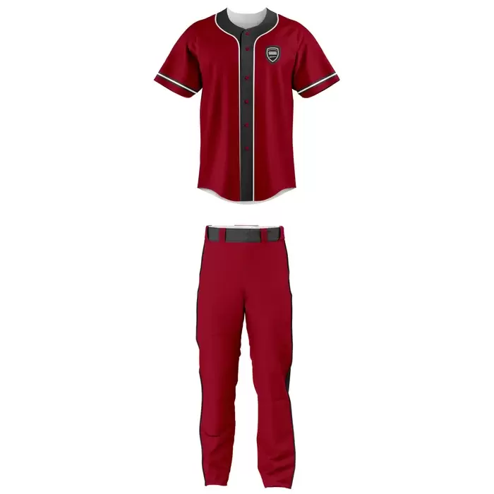 Discover premium baseball uniforms from Colaro Sports, the leading manufacturer of high-performance baseball uniforms designed for champions. Colaro Sports custom cut & sew baseball uniform: fiery red jersey with black placket/collar trim, crisp white sleeve piping, chest crest, paired with red long pants featuring bold black side stripes and black belt.