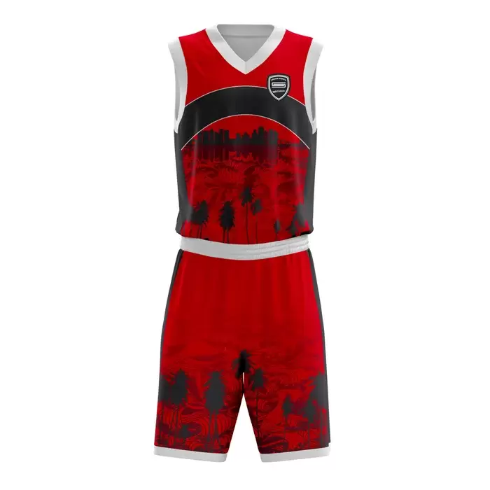 Discover premium basketball uniforms from Colaro Sports, the leading manufacturer of high-performance basketball uniforms designed for champions. Colaro Sports fierce red, black, and white sublimated basketball uniform. Dark tree and cityscape silhouettes cover this sleeveless V-neck jersey with a wide black chest stripe. Fully customizable, intimidating, and built to dominate.