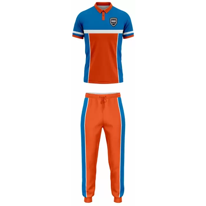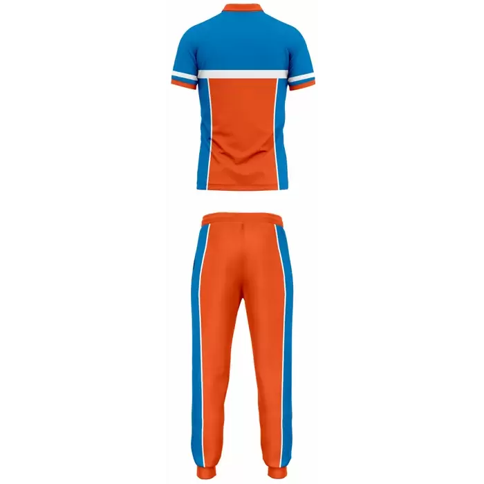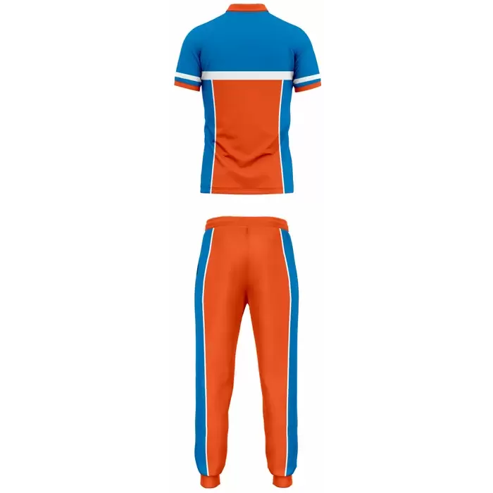 Discover premium bowling uniforms from Colaro Sports, the leading manufacturer of high-performance bowling kits designed for champions. Colaro Sports Blue & Orange Cut & Sew Bowling Uniform two-piece bowling set featuring a dynamic blue orange polo shirt with white chest stripe and matching long track pants with bold side panels. Our custom cut & sew bowling jerseys by Colaro Sports, perfect blend of style and performance.