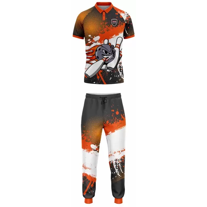 Colaro Sports, a premium ten-pin bowling uniform manufacturer, presents its signature flaming ball bowling uniform. Colaro Sports Black & Orange Flaming Ball Sublimation Bowling Uniform, the most aggressive bowling apparel. By using cutting-edge dye sublimation, we permanently infuse wild ink splatters, halftone dots, and a massive flaming bowling ball graphic into premium performance fabric. Our two-piece set delivers unmatched visual impact and championship-level comfort.