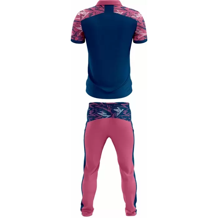 Colaro Sports, a premium cricket uniform manufacturer, presents its signature navy blue and pink cricket uniform. Colaro Sports cricket uniform engineered two-piece kit features a dominant navy blue short-sleeved polo shirt electrified by a vibrant pink collar and explosive pink patterned shoulders and sleeves that demand attention. The design flips boldly on the full-length athletic pants: a pink base with powerful navy blue side stripes running down each leg, creating one of the most daring and coordinated looks in cricket today.
