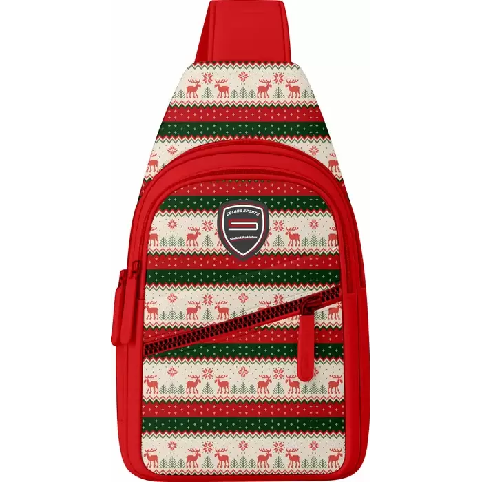 Colaro Sports, a premium bag manufacturer, presents its signature red and white cross-body bag. Colaro Sports' delightful design features a carefully crafted repeating pattern showcasing red reindeer, green evergreen trees, and white snowflakes against a crisp white background, capturing the essence of winter wonderland charm. Every detail celebrates the season's joy.