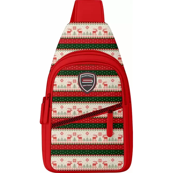 Discover premium cross-body bags from Colaro Sports, the leading manufacturer of high-performance cross-body bags crafted specifically for athletes. Colaro Sports cross-body bag celebrates Christmas with a charming red and white design. Featuring repeating patterns of red reindeer, green trees, and white snowflakes against a white background, this holiday-themed bag spreads seasonal cheer. The red zipper with snowflake decoration, matching top handle, and round Colaro Sports patch create a perfect winter accessory appeal for holiday celebrations.