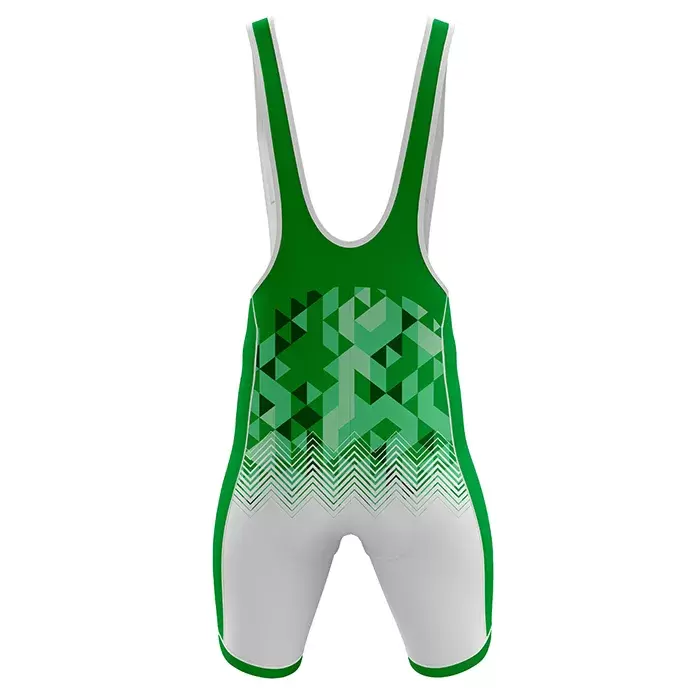 Colaro Sports, a premium cycling singlet manufacturer, presents its signature white and green cycling singlet. Colaro Sports' white and green sublimation cycling bib singlet cutting-edge one-piece features an explosive upper-chest mosaic of multi-shade green triangles and polygons that seamlessly morph into razor-sharp zig-zag chevrons across the mid-section. Clean white base with bold green side panels, armhole trim, leg grippers, and shoulder straps create a fresh, unstoppable aesthetic.