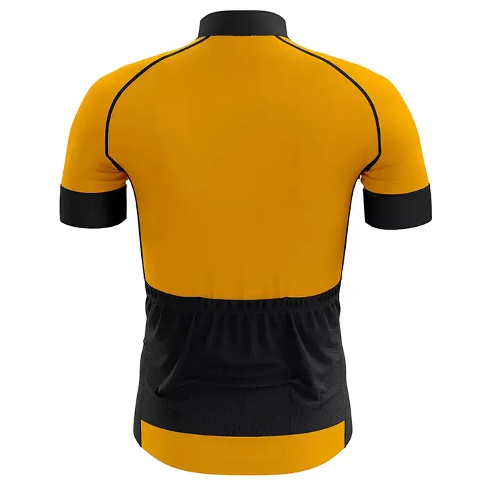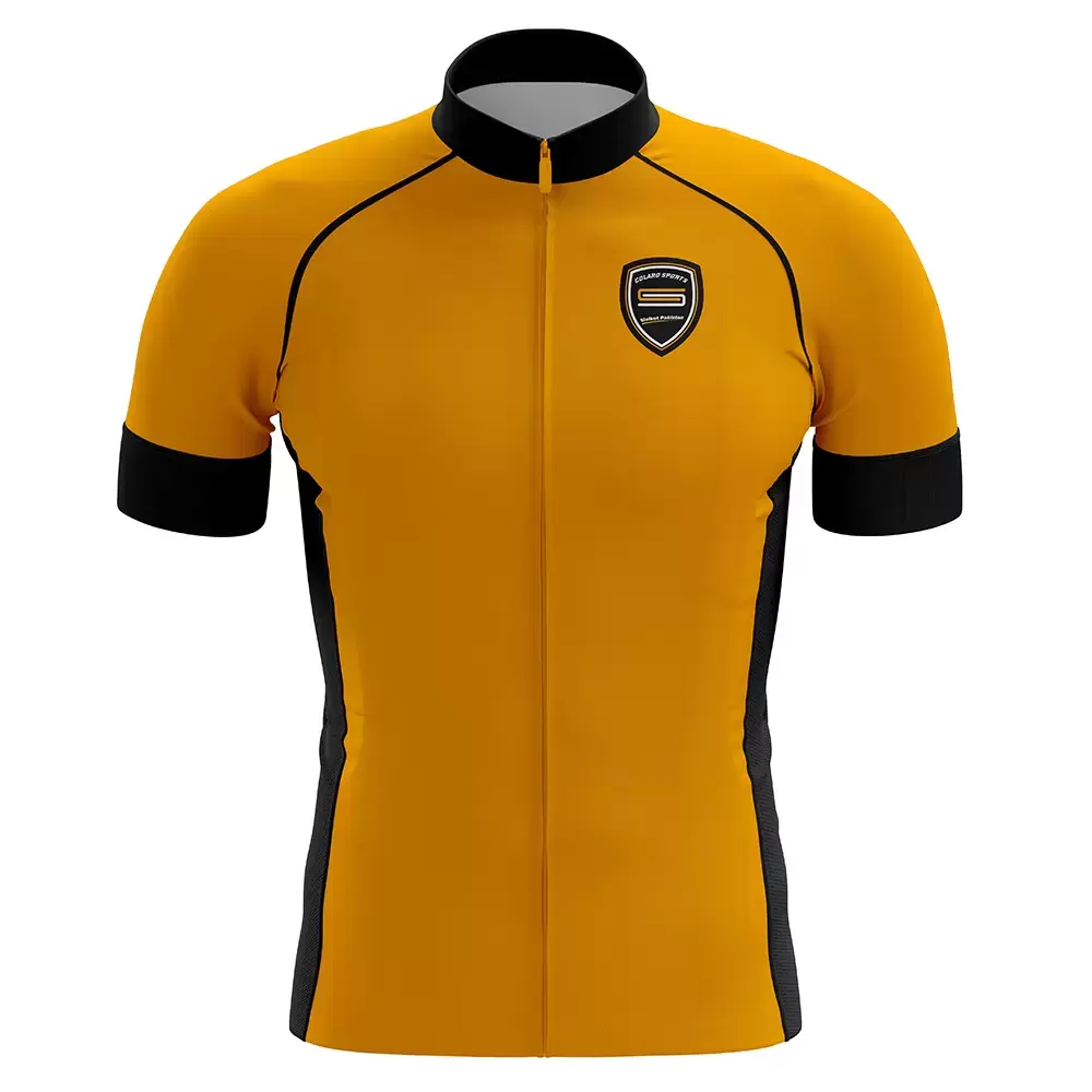 Discover premium cycling jerseys from Colaro Sports, the leading manufacturer of high-performance cycling jerseys designed for champions. Colaro Sports golden yellow custom cycling jersey with black accents short-sleeve design featuring black side panels, stand-up collar, sleeve cuffs, raglan piping, and full-length zipper.