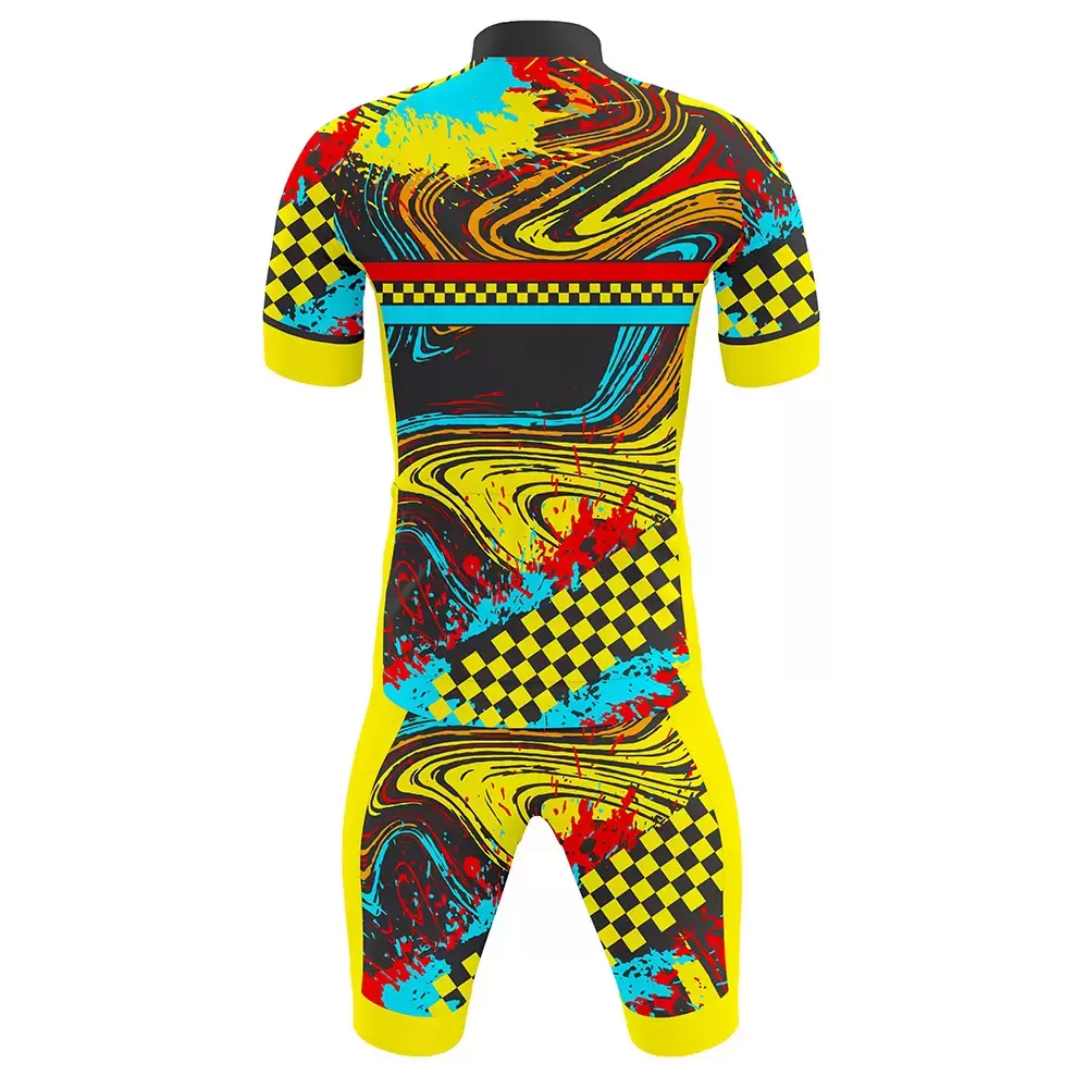 Discover premium cycling skinsuits from Colaro Sports, the leading manufacturer of high-performance cycling skinsuits designed for champions. Colaro Sports sublimation cycling speedsuit. This wild yellow-based custom cycling uniform features swirling abstract patterns, red-blue paint splatters, checkerboard bands, and teal stripes. Short-sleeve, short-leg race cut with permanent vibrant colors.