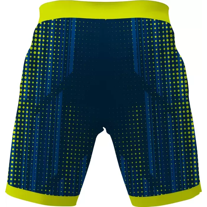 Colaro Sports, a premium gym shorts manufacturer, presents its signature yellow-green gym shorts. Colaro Sports' soccer-inspired shorts that combine playful design with serious performance. The rich navy blue base provides the perfect backdrop for bright yellow-green polka dots and coordinating vertical stripes, creating a pattern that's both fun and sophisticated. The vibrant yellow waistband adds a bold accent that ties the entire design together with visual confidence.