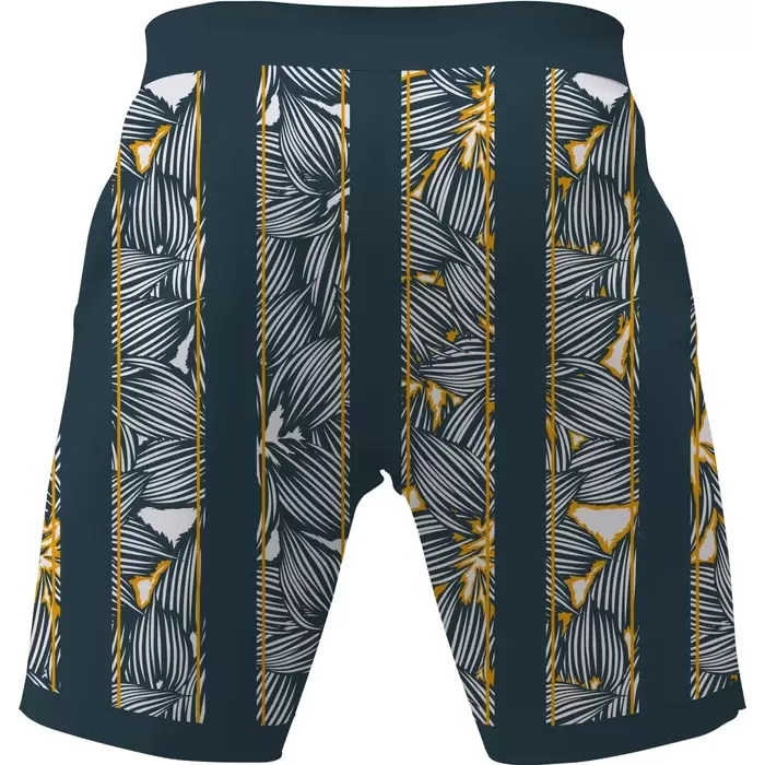 Colaro Sports, a premium gym shorts manufacturer, presents its signature white and gold gym shorts. Colaro Sports' navy blue athletic shorts. These sophisticated shorts feature distinctive vertical stripes showcasing an elegant monochrome floral pattern in white and gold, creating a refined aesthetic that stands apart from typical athletic wear. The thoughtful design elevates these shorts from purely functional gear to versatile lifestyle pieces.