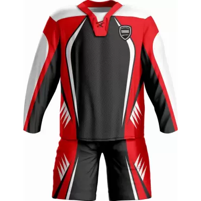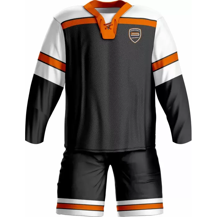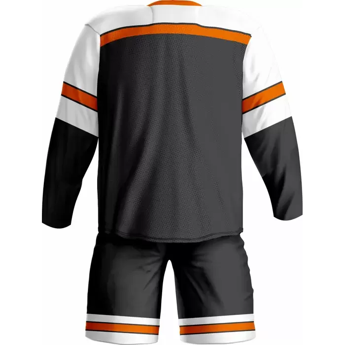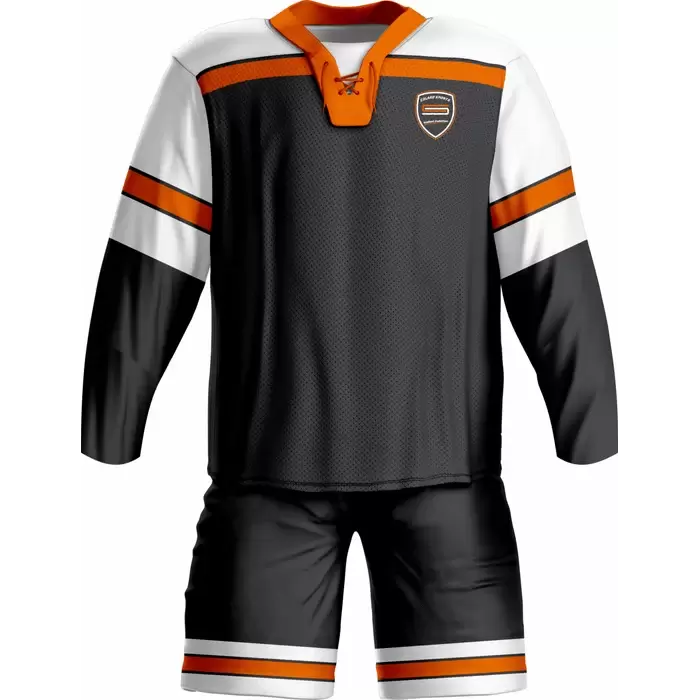 Discover premium ice hockey uniforms from Colaro Sports, the leading manufacturer of high-performance ice hockey uniforms designed for champions. Colaro Sports black ice hockey uniform featuring white sleeves, orange stripes, and a laced V-neck. This premium sublimation custom ice hockey jersey and shorts combo dominates the rink.