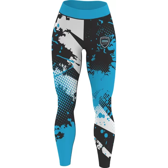 Colaro Sports, a premium leggings manufacturer, presents its signature black and blue tight. Colaro Sport black and blue athletic leggings featuring an electrifying abstract pattern. The dynamic design showcases aggressive brushstroke-like splatters combined with dotted textures, creating an edgy, urban-inspired aesthetic that breaks from traditional athletic wear conventions. Splashes of white and grey add depth and dimension to the predominantly black and blue color scheme, resulting in a modern, street-ready look.