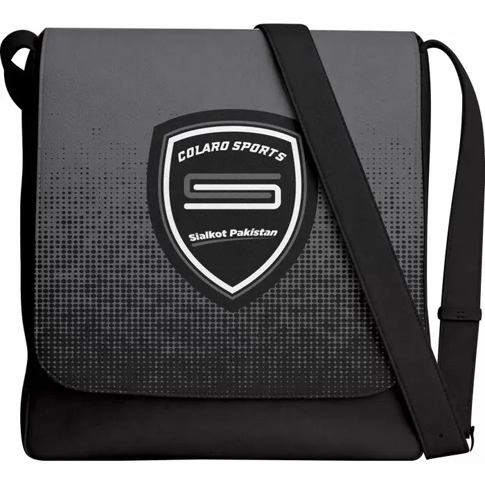 Discover a premium messenger bag from Colaro Sports, the leading manufacturer of high-performance messenger bags crafted specifically for athletes. Colaro Sports gradient messenger bag combines sophistication with athletic style. Featuring a stunning dark gray-to-black transition with dotted texture on top and solid black below, this bag makes a bold statement. The prominent white Colaro Sports emblem takes center stage, while the diagonal black strap with metal buckle adds functional elegance. Smooth, slightly glossy finish completes this premium design.