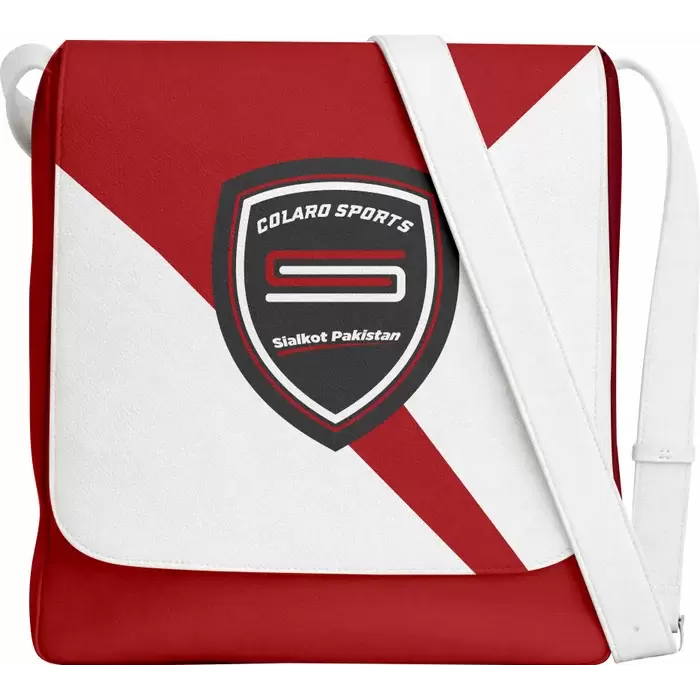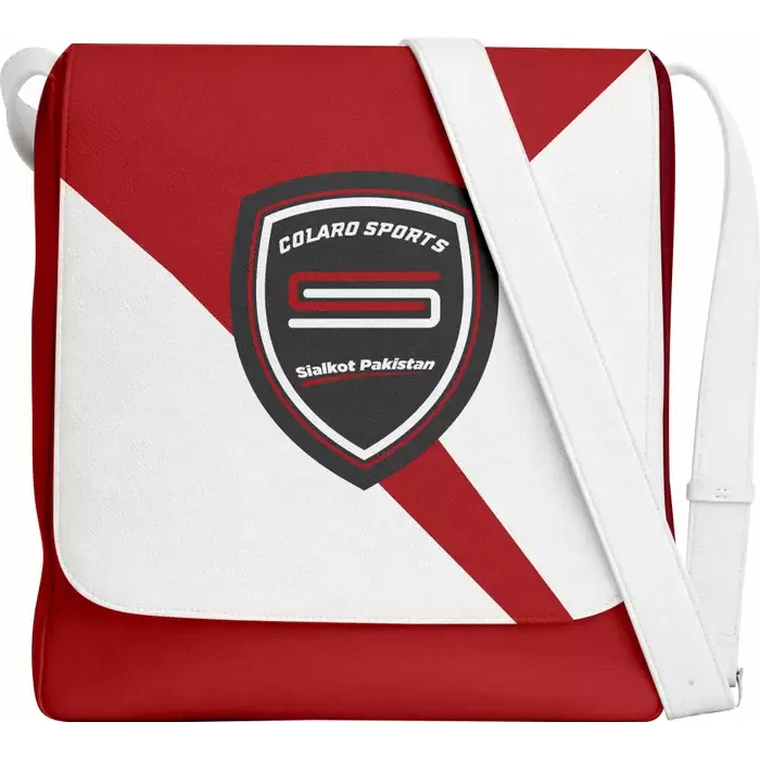 Discover a premium messenger bag from Colaro Sports, the leading manufacturer of high-performance messenger bags crafted specifically for athletes. Colaro Sports red and white satchel messenger bag embodies modern sophistication. A bold diagonal red stripe divides the bag's white upper and red lower sections, creating a striking visual impact. The prominent shield emblem features "COLARO SPORTS" in red with white and black accents. Smooth, durable material and a white shoulder strap complete this stylish, contemporary design.