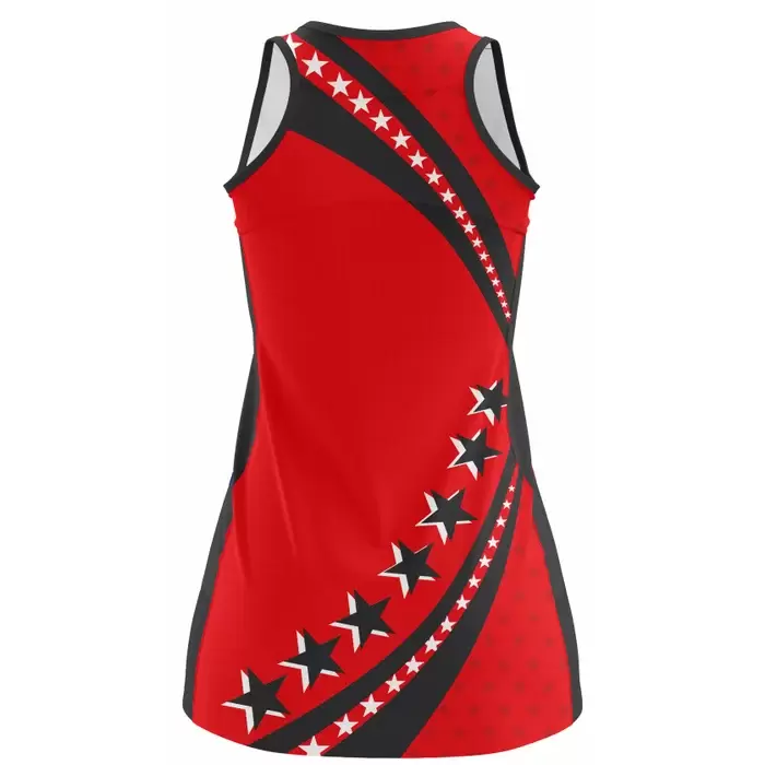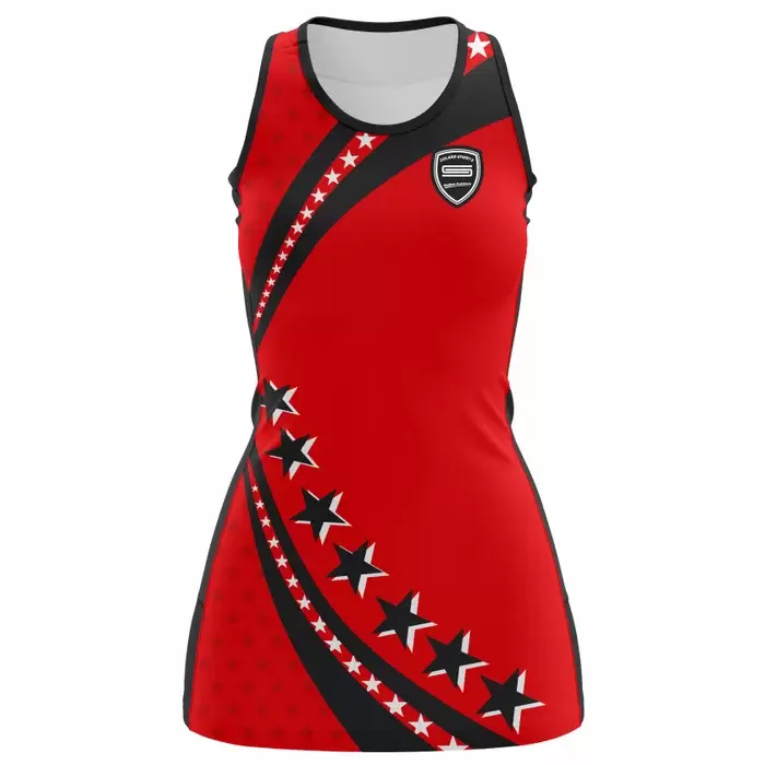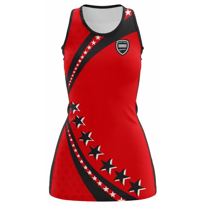 Discover premium netball uniforms from Colaro Sports, the leading manufacturer of high-performance netball uniforms designed for champions. Colaro Sports full sublimated netball uniform. Bold red body, dramatic diagonal black stripe with massive, white-outlined stars, and sharp black trim. Fully customizable, fade-proof, lightweight, the ultimate high-impact custom sublimated netball dress for teams.