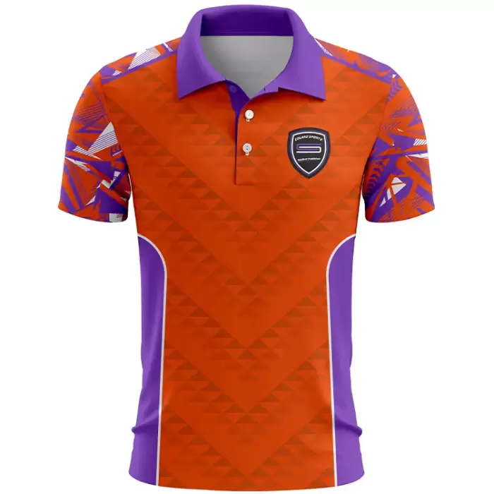 Discover premium Polo T-shirts from Colaro Sports, the leading manufacturer of high-performance Polo T-shirt designed for extreme workouts. Colaro Sports sublimation polo t-shirt in explosive orange chevron patterns and royal purple side trim. Lightweight, stretchable, and fully customizable with chest logo. Perfect custom activewear for running, outing, and training.
