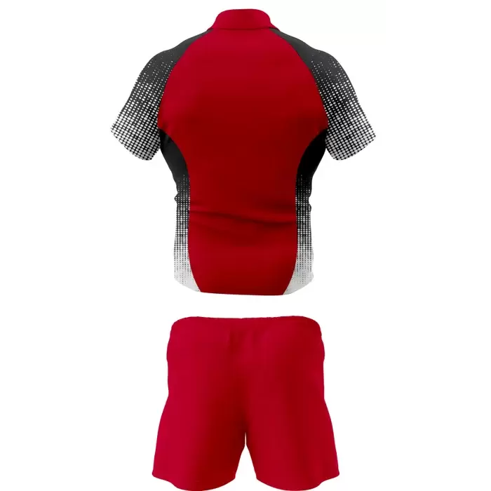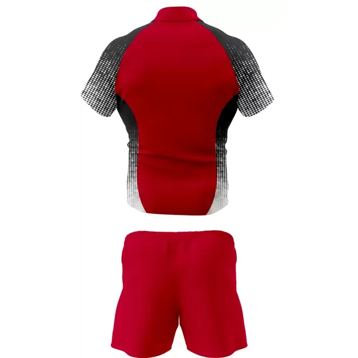 Colaro Sports, a premium rugby uniform manufacturer, presents its signature red and black uniform. Colaro Sports red and black pixelated rugby uniform, engineered using state-of-the-art dye-sublimation. The bold red short-sleeved jersey displays dramatic black side panels and raglan sleeves with a speckled pixelated pattern fading to white, matched with clean, solid red shorts perfect for teams. Colaro Sports sets the global standard in custom sublimated rugby apparel. Preferred by teams seeking custom red and black rugby kits, sublimation rugby jerseys, and elite teamwear from top manufacturer Colaro Sports.