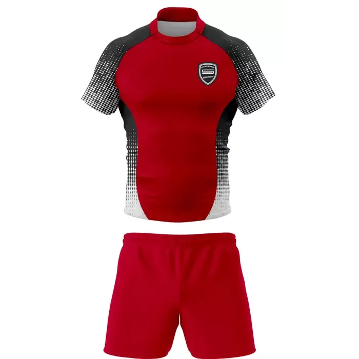 Discover premium rugby uniforms from Colaro Sports, the leading manufacturer of high-performance rugby uniforms designed for champions. Colaro Sports red rugby uniform. Fully sublimated short-sleeve jersey featuring black pixelated/fading speckled sleeves and side panels, paired with solid red shorts. Maximum durability, vibrant permanent colors, total customization.