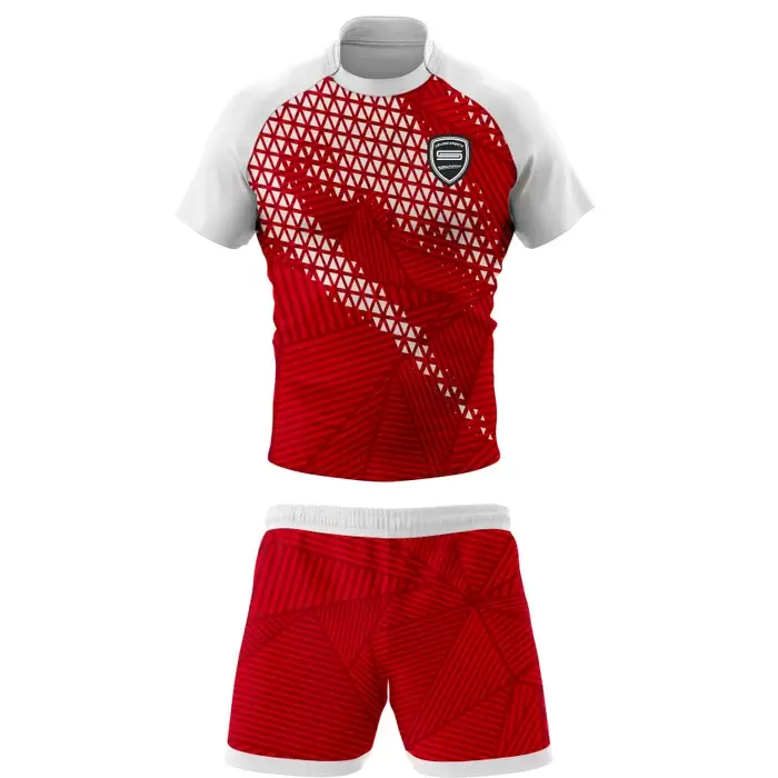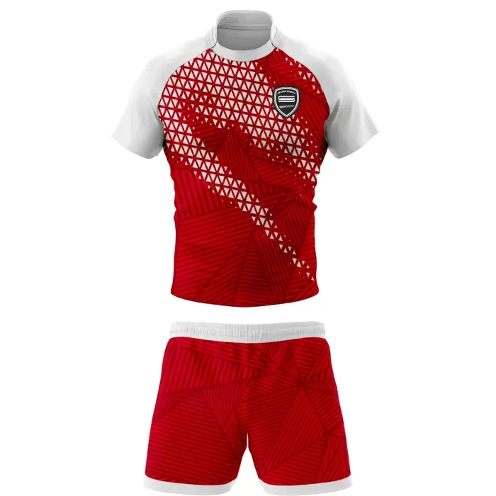 Discover premium rugby uniforms from Colaro Sports, the leading manufacturer of high-performance rugby uniforms designed for champions. Colaro Sports red and white sublimation rugby uniform, a bold short-sleeve rugby jersey with white raglan sleeves, dynamic white triangle geometric pattern fading into vibrant red body, paired with matching red rugby shorts featuring white waistband and subtle textured detailing. Fully customizable, moisture-wicking, and durable.