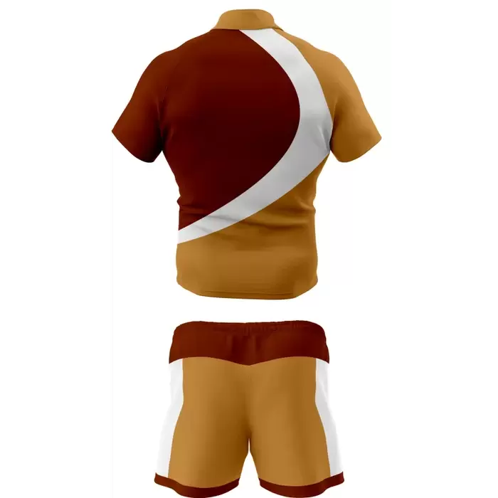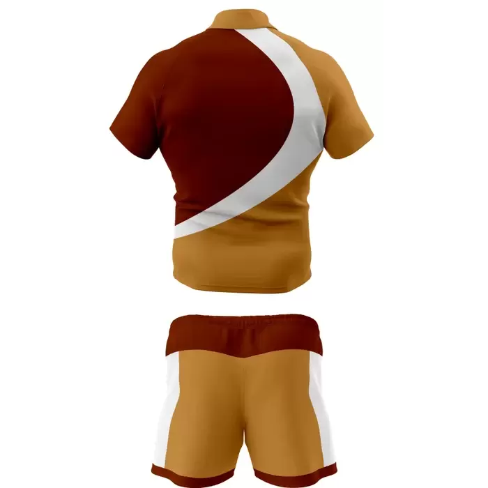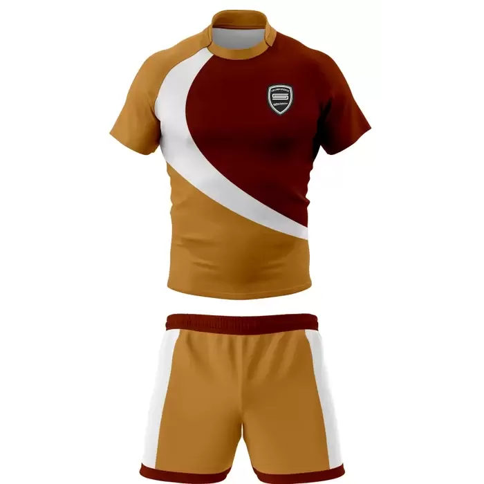 Discover premium rugby uniforms from Colaro Sports, the leading manufacturer of high-performance rugby uniforms designed for champions. Colaro Sports maroon and gold rugby uniform featuring a dramatic curving white stripe across the chest. Paired with gold shorts and vertical white side panels. Elite sublimation craftsmanship for teams that play with flair.
