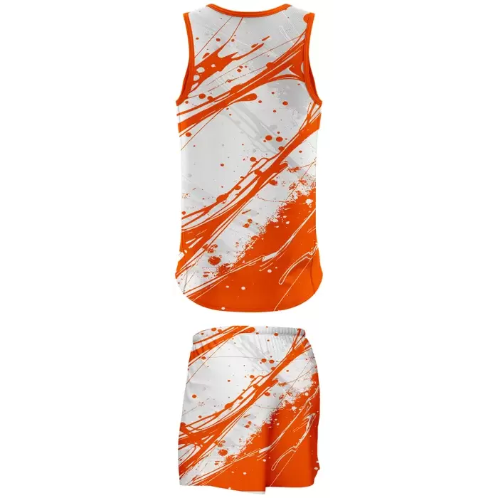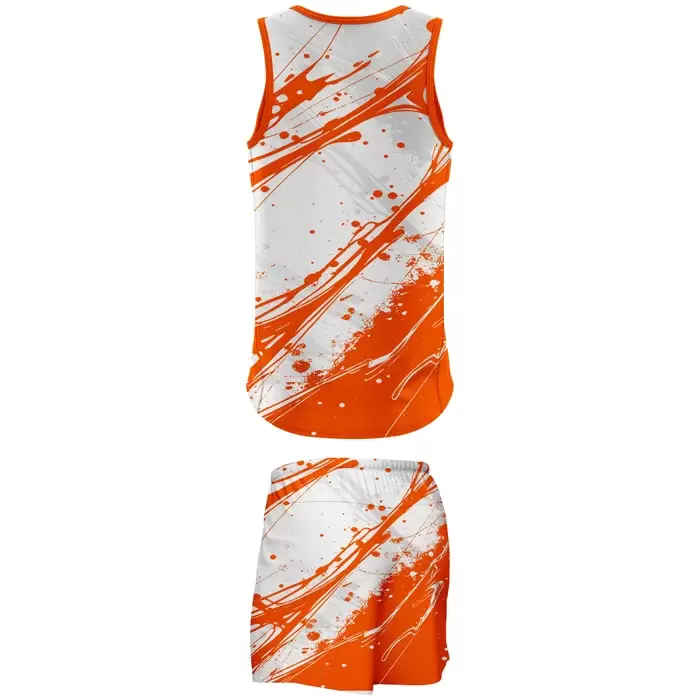 Colaro Sports, a premium running suits manufacturer, presents its signature orange and white suit. Colaro Sports orange paint splatter sublimation running suit, the boldest custom athletic running set on the planet. This design features chaotic orange and white paint-splatter patterns across both the sleeveless tank and matching shorts, perfectly capturing the intensity of sprinting toward the finish line.