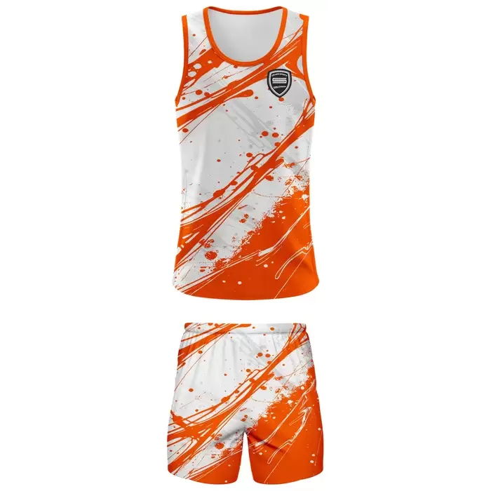 Discover premium running suits from Colaro Sports, the leading manufacturer of high-performance running suits designed for extreme game. Colaro Sports orange paint splatter sublimation running suit. Wild orange and white splatter design with circular chest logo. Lightweight tank top + shorts set. The most energetic custom running suit, unmatched style, and performance. Perfect men’s/women’s running suit for track, gym, or marathon training.
