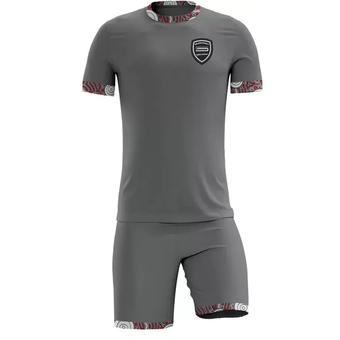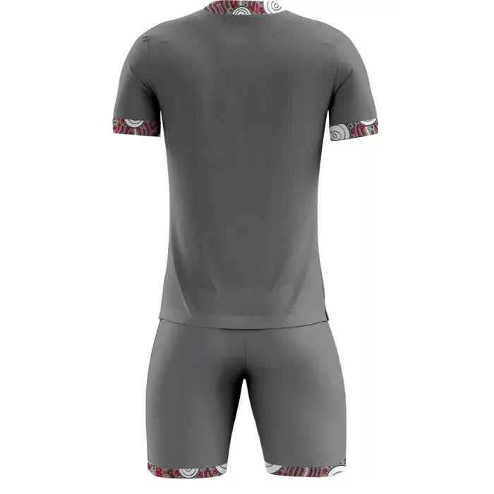 Discover premium soccer uniforms from Colaro Sports, the leading manufacturer of high-performance soccer uniforms designed for champions. Colaro Sports dark gray sublimation soccer uniform featuring a bold red-black-white shield crest and matching abstract collar/cuff patterns. Short-sleeve jersey and shorts set with permanent dye-sublimation printing.