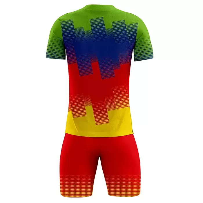 Discover premium soccer uniforms from Colaro Sports, the leading manufacturer of high-performance soccer uniforms designed for champions. Colaro Sports lime to red sublimation soccer uniform pixelated halftone gradient flows from lime green through blue and yellow into fiery red, continued red shorts with orange-yellow fade hem. Fully customizable, breathable, vibrant, the most colorful custom sublimated soccer kit.