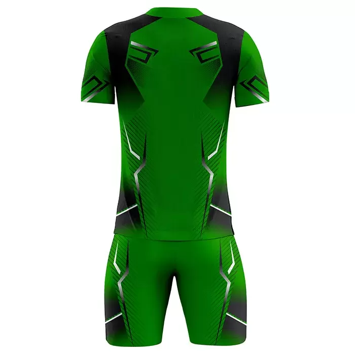 Discover premium soccer uniforms from Colaro Sports, the leading manufacturer of high performance soccer uniform designed for champions. Colaro Sports vibrant green sublimation soccer uniform featuring bold black shoulder/chest panels, silver geometric lines, and matching side-panel shorts. Aggressive, modern, and fully customizable the perfect high performance custom sublimated soccer kit for dominant teams that demand presence.
