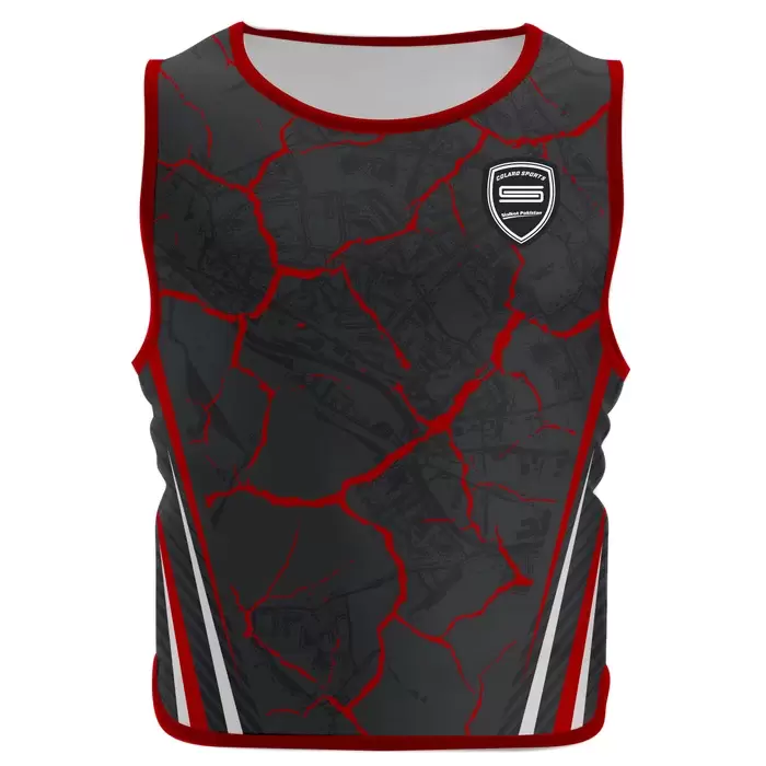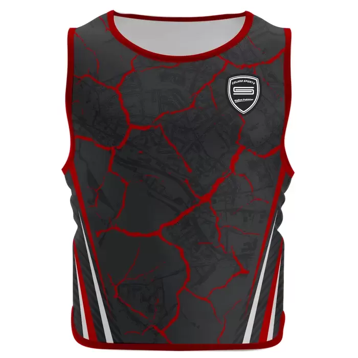 Discover premium sports bib from Colaro Sports, the leading manufacturer of high-performance training bib designed for champions. Colaro Sports offers a premium black sports vest with an eye-catching red cracked rock sublimation pattern. A finely embroidered white and red logo on the left chest represents team pride, complemented by a sharp white and red bottom stripe. Crafted from breathable, moisture-wicking fabric, this modern vest ensures comfort and style during intense athletic performance.