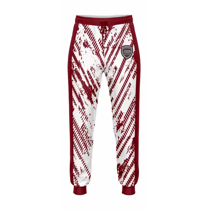 Discover premium Sweatpants from Colaro Sports, the leading manufacturer of high-performance Sweatpants designed for extreme workouts. Colaro Sports presents sweatpants designed for modern athletes who value comfort and flair. Featuring a white base with bold burgundy stripes and a dynamic splattered effect, these joggers combine smooth, breathable fabric with a relaxed fit. A shield logo adds subtle branding, while the energetic design ensures standout style for training, casual wear, or team-inspired collections.