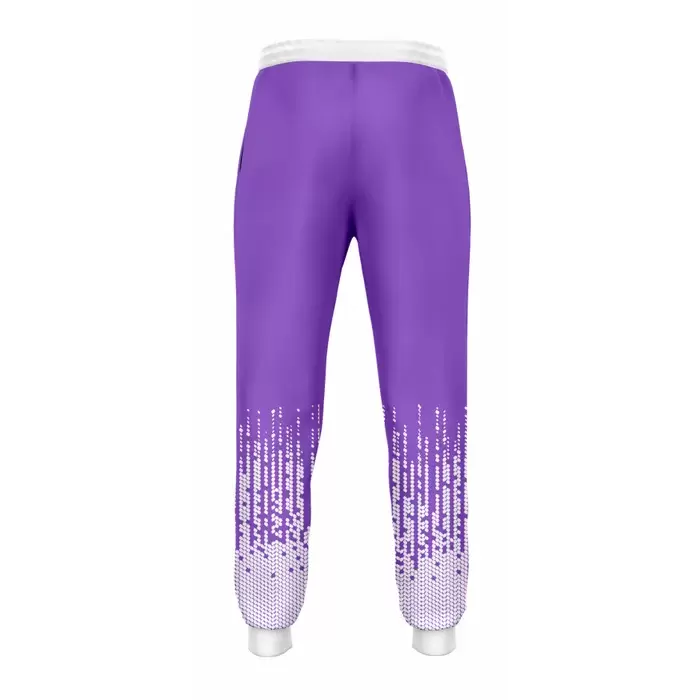 Colaro Sports, a premium sweatpants manufacturer, presents its signature white and blue sweatpant. Colaro Sport presents sweatpants that embody a modern, sporty aesthetic with a vibrant twist. The design centers on a bold purple base, accented by a striking gradient of small white squares that fade toward the ankles. White details on the waistband and drawstring provide clean contrast, enhancing the overall contemporary look. These joggers are crafted from smooth synthetic fabric, ensuring comfort and durability for both athletic and casual use.