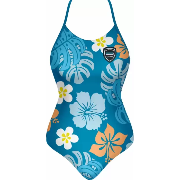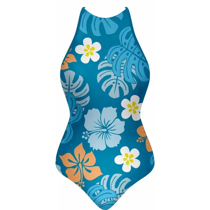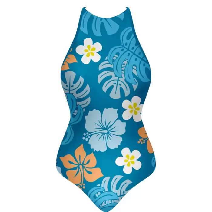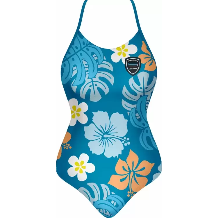 Discover premium Swimsuits from Colaro Sports, the leading manufacturer of high-performance Swimsuits designed for champions. Colaro Sports presents this vibrant sublimated one-piece swimsuit, featuring a tropical floral pattern on premium polyester blend fabric. Bold blue base with large white and orange hibiscus flowers, accented by yellow centers, creates a summery appeal. Designed with a high neckline, thin straps, front zipper, and a signature circular logo for style and functionality.