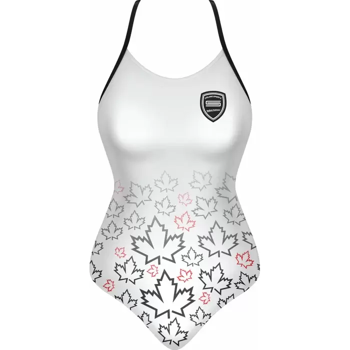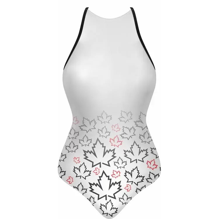 Discover premium Swimsuits from Colaro Sports, the leading manufacturer of high-performance Swimsuits designed for champions. Colaro Sports elegant sublimated sleeveless one-piece swimsuit in crisp white. The top half remains plain, transitioning to a bottom gradient of black and pink maple leaves on premium fabric. Thin black straps and a black-and-red chest logo complete the sophisticated, nature-inspired design perfect for stylish swimmers.