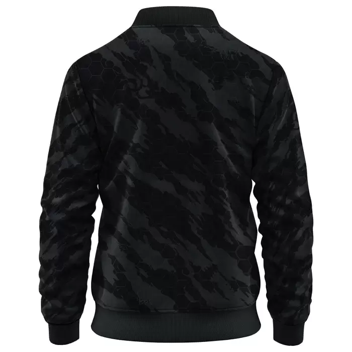Discover a premium Jacket from Colaro Sports, the leading manufacturer of high-performance Jacket designed for champions. Colaro Sports introduces the Training Jacket, a bold sublimation bomber jacket featuring a striking black camo pattern with dark hexagonal shapes over a lighter black base. A white interior lining, white embroidered Colaro Sports logo, and ribbed collar, cuffs, and hem complete the sporty, modern silhouette crafted from a smooth polyester-spandex blend for comfort and flexibility.