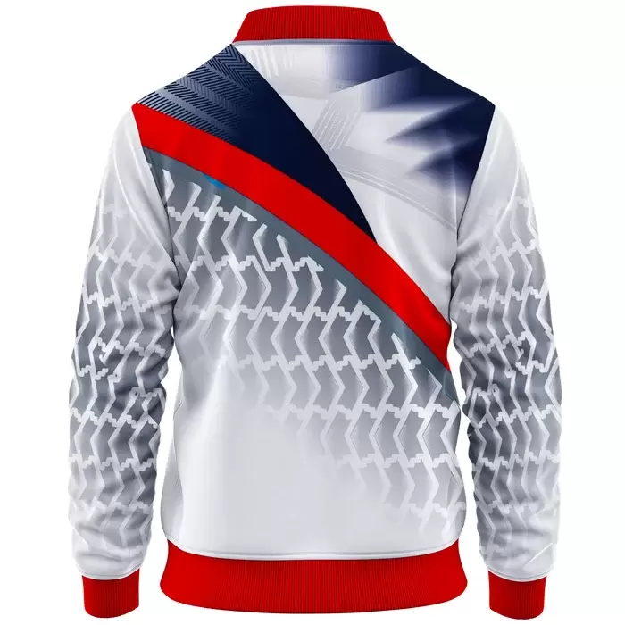 Colaro Sports, a premium Jacket manufacturer, presents its signature blue, white, gray, and red. Colaro Sports is a visually complex and artistically sophisticated sublimation bomber jacket that showcases the full potential of modern sportswear design. The predominantly white base provides a crisp, clean canvas for the intricate gray and red geometric patterns that adorn the sleeves and shoulders, creating a structured yet dynamic visual composition. The striking blue and white gradient on the left side adds depth and dimension, while the bold red diagonal stripe on the right introduces an asymmetric energy that keeps the design engaging from every angle.