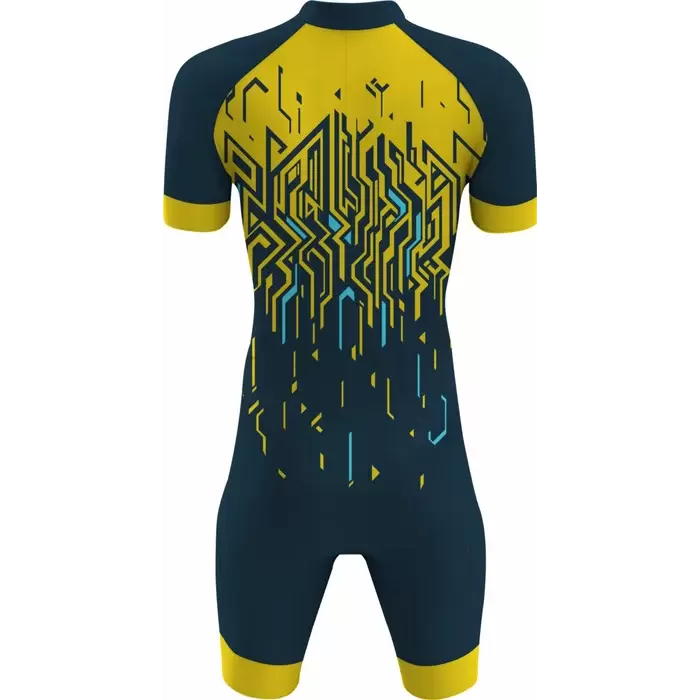 Discover premium Triathlon Uniforms from Colaro Sports, the leading manufacturer of high-performance triathlon uniforms designed for champions. Colaro Sports offers a sleek triathlon outfit in navy blue with bright yellow accents. Featuring a gradient transition and intricate circuit-inspired patterns, the bodysuit and shorts deliver a cohesive, modern look. Made from high-performance Lycra, this outfit ensures breathability, flexibility, and durability, supporting cyclists with comfort and style in competitive environments.