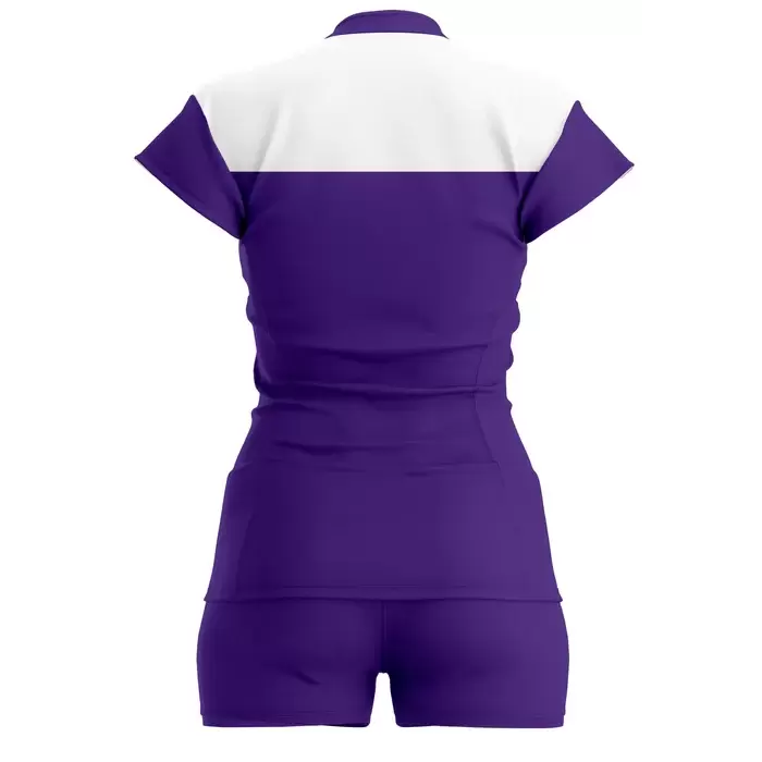 Discover premium sports uniforms from Colaro Sports, the leading manufacturer of high-performance volleyball uniforms designed for champions. Colaro Sports presents a classic white and navy blue cut-and-sew uniform. The short-sleeved jersey features a striking V-shaped navy design on the front and a matching emblem on the chest. Paired with navy shorts, this polyester-spandex blend offers a snug, comfortable fit ideal for high-performance sports.