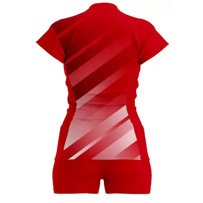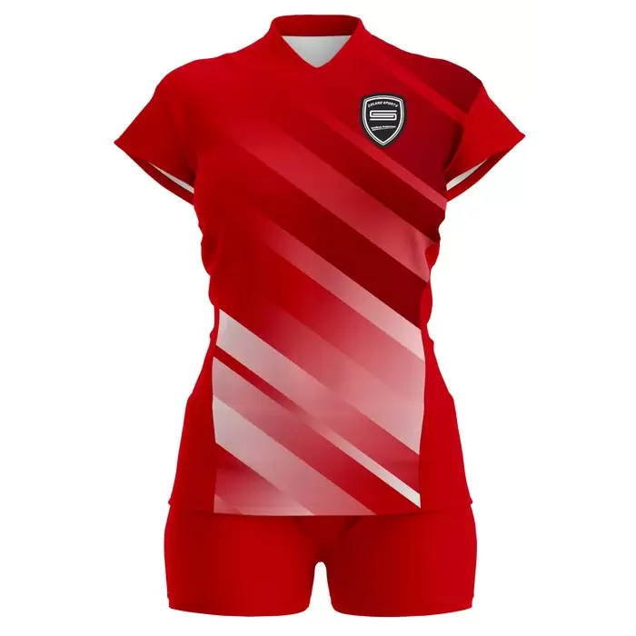 Colaro Sports, a premium volleyball uniform manufacturer, presents its signature red uniform. Colaro Sports brings passion to the pitch with this striking red uniform, featuring a captivating gradient pattern of overlapping red and white diagonal stripes. The short-sleeved jersey incorporates a classic V-neckline for comfort and breathability, while an embroidered shield crest on the left chest adds a touch of heritage and professionalism. The matching shorts complete the kit, ensuring a cohesive look that stands out under stadium lights.