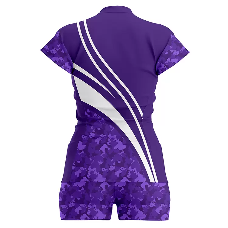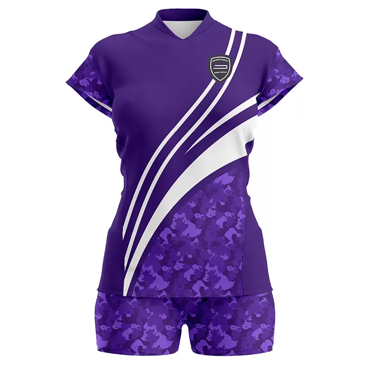 Discover premium sports uniform from Colaro Sports, the leading manufacturer of high-performance volleyball uniform designed for champions. Colaro Sports introduces a sophisticated deep purple kit with white accents. The short-sleeve V-neck jersey boasts a shield logo on the chest and a unique purple camouflage pattern on the sleeves and lower body. Fully sublimated for vivid, lasting details, this design combines mystery and intensity in breathable, high-performance athletic wear.