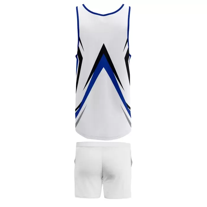 The embroidered logo on the left chest represents Colaro Sports' commitment to quality craftsmanship and attention to detail. The matching plain white shorts with adjustable drawstring waistband provide functional simplicity that allows the top's design to shine while ensuring players maintain a comfortable, secure fit throughout the match. Advanced sublimation printing guarantees the blue and black geometric patterns remain sharp and vibrant through countless competitions. This uniform's modern design philosophy appeals to teams seeking a fresh, contemporary look that balances bold visual elements with clean, professional presentation—the hallmark of Colaro Sports excellence.
