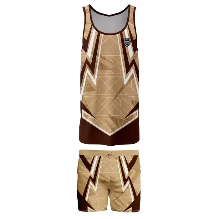 Discover premium AFL uniforms from Colaro Sports, the leading manufacturer of high-performance AFL uniforms designed for champions. Colaro Sports presents Art Deco-inspired AFL uniform with distinctive zigzag geometric pattern. The sleeveless crew-neck tank top and matching shorts feature bold patterns in brown, beige, and white shades, creating vintage-modern fusion aesthetics. The vibrant, stylized design brings a fashionable twist to athletic wear. This unique uniform appeals to teams seeking standout retro-contemporary style combined with modern performance functionality.