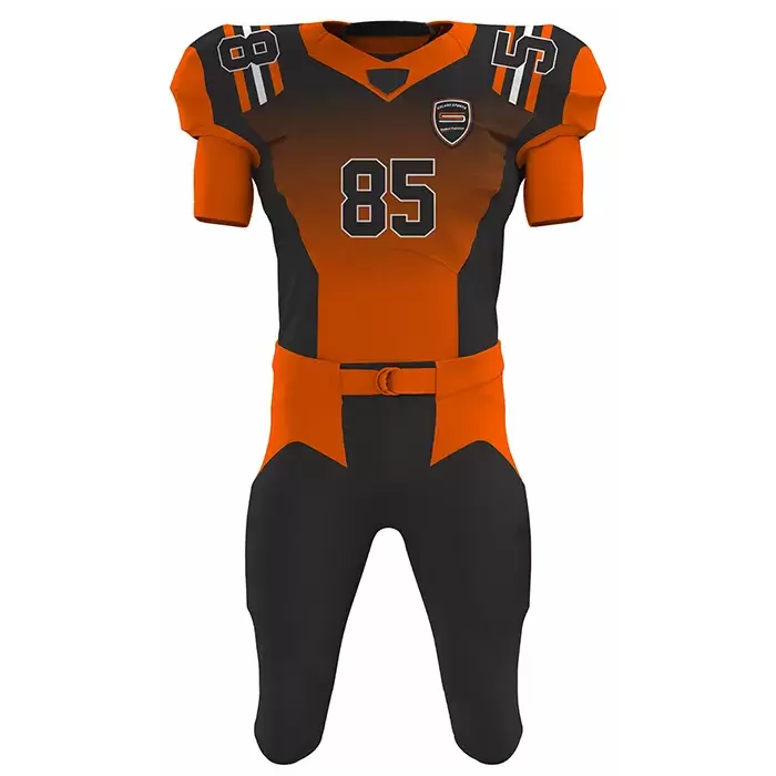 Discover premium American Football uniforms from Colaro Sports, the leading manufacturer of high-performance American Football uniforms designed for champions. Colaro Sports presents a modern orange and black American football uniform designed for high school and college teams. Featuring bold white number 85 and a prominent team logo, this sublimated uniform delivers a sleek, powerful look. The matching pants with black accents ensure durability, flexibility, and standout performance on the field.