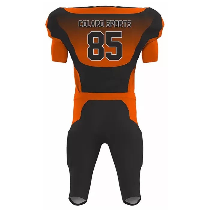 Colaro Sports, a premium American football uniform manufacturer, presents its signature orange and black uniform. Colaro Sports introduces a striking orange and black sublimation American football uniform built for teams that want confidence and visibility. The jersey showcases a bold white number 85 on the front, paired with a team logo above for a professional appearance. Designed with a sleek and modern silhouette, the uniform enhances movement while maintaining a strong athletic identity.