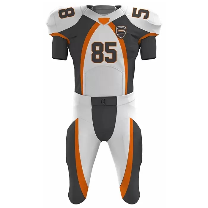 Discover premium American Football uniforms from Colaro Sports, the leading manufacturer of high-performance American Football uniforms designed for champions. Colaro Sports introduces a clean white and gray American football uniform accented with bold orange details. Featuring a V-neck jersey and striking number 85, this sublimated design combines elegance and performance. The coordinated stripes and team logo create a professional look, ideal for teams seeking modern style and comfort.